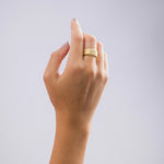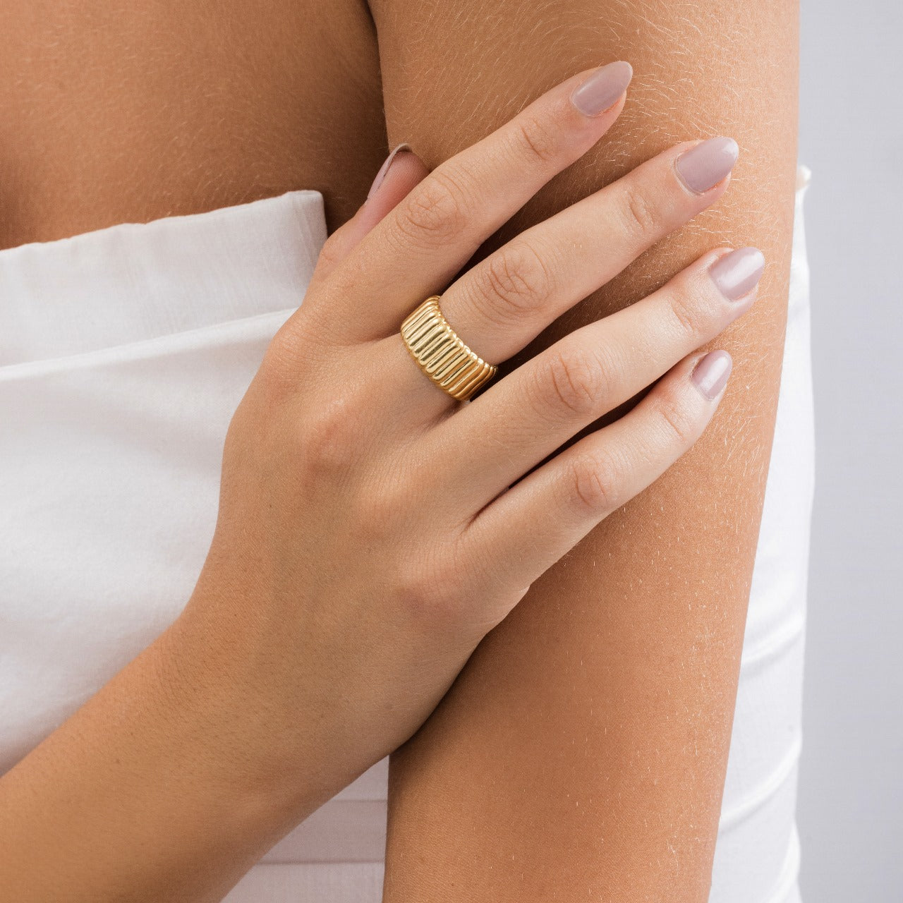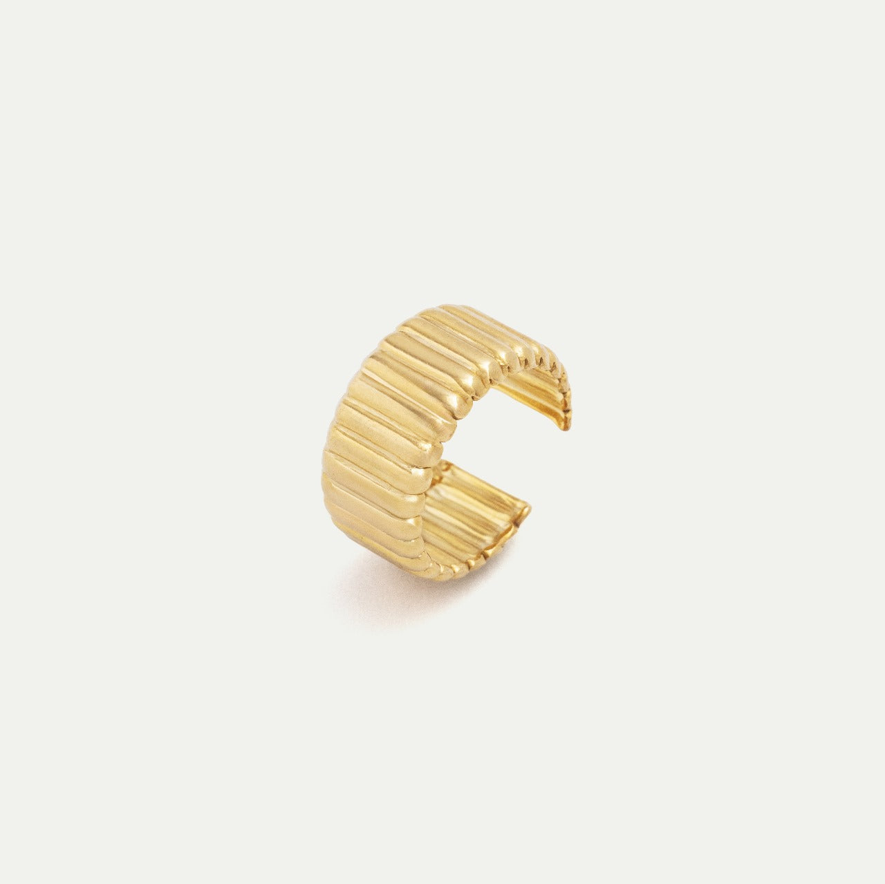 Timeless jewelry you can count on. This ribbed gold ring is crafted from stainless steel and features a bold, sculptural silhouette that exudes modern elegance. Wear it alone for a statement look or pair it with the dome mini hoop earrings for a chic effect.