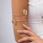 Timeless jewelry you can count on. The Gold molten spiral arm bangle wraps elegantly around the arm with its sculptural, fluid design, evoking a sense of bold artistry and movement. Let it shine on its own for a striking statement